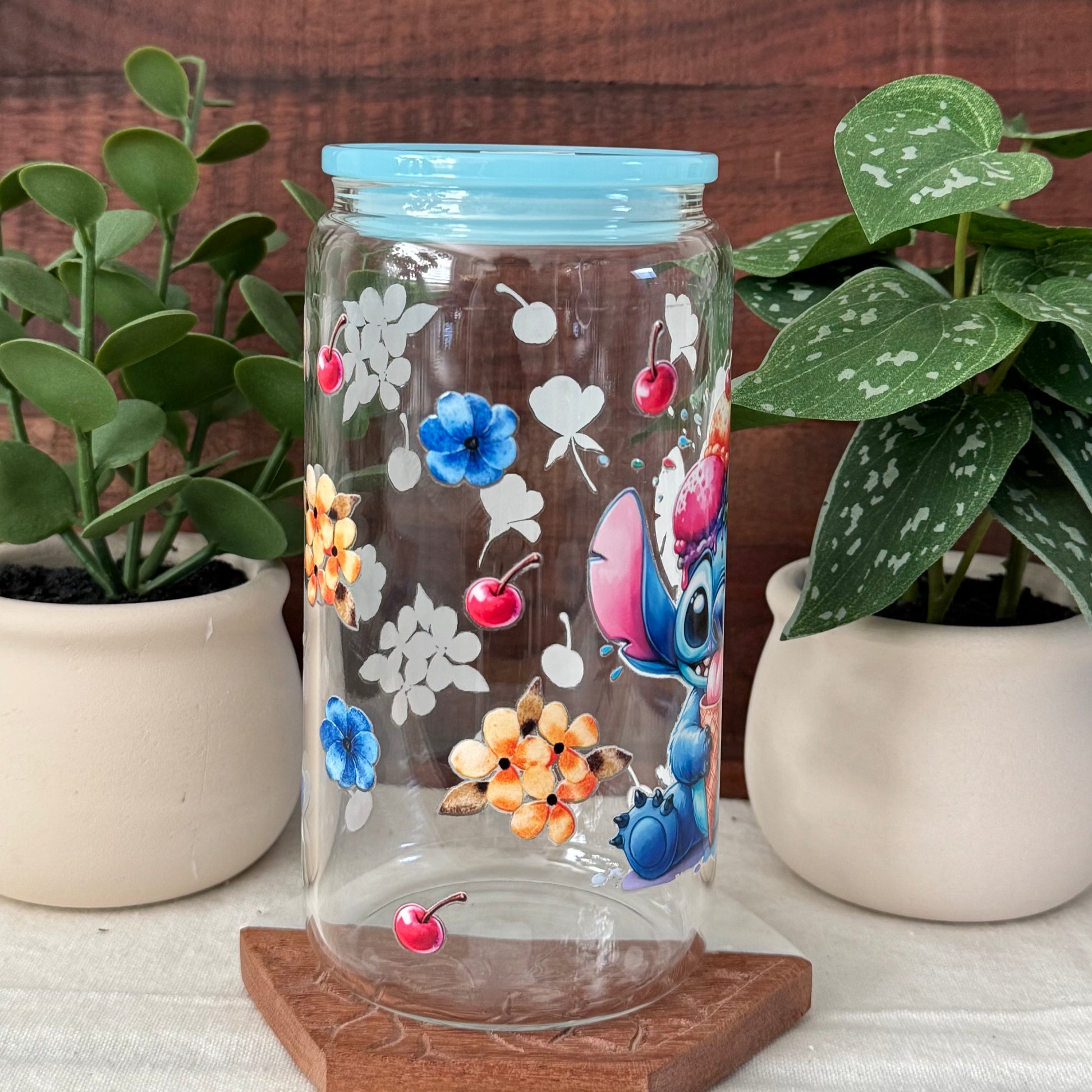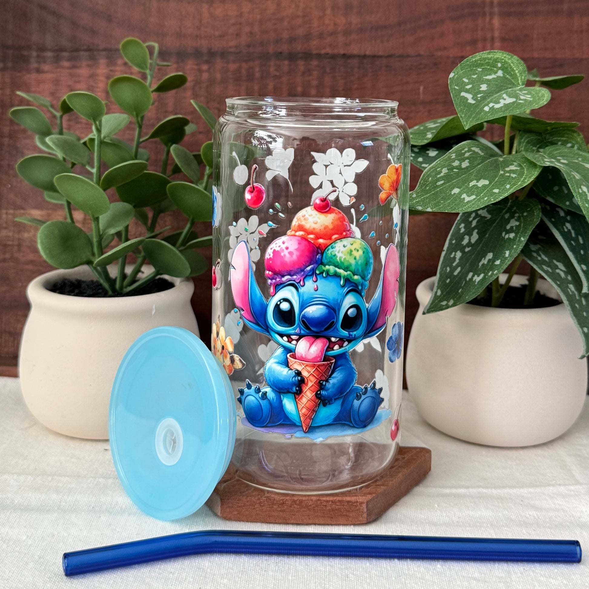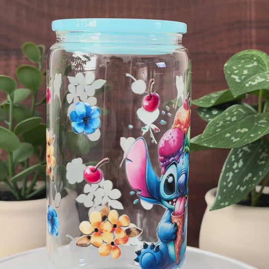 Cute glass can cup with Stitch eating ice cream. Has colorful flowers and cherries all around. Comes with a blue lid and a matching blue glass straw. Great for your favorite cold drinks!