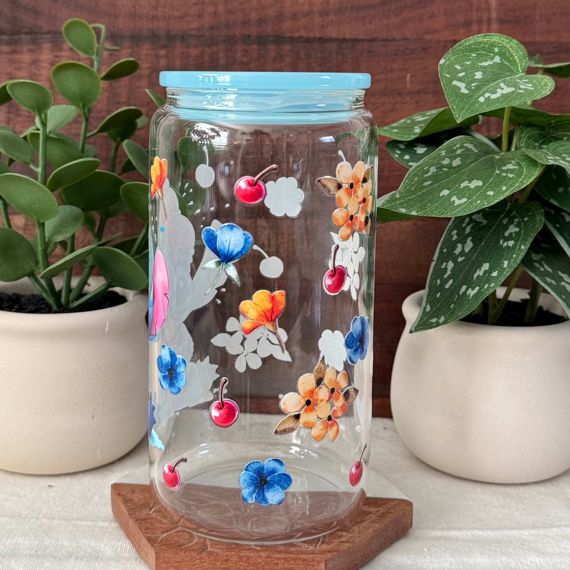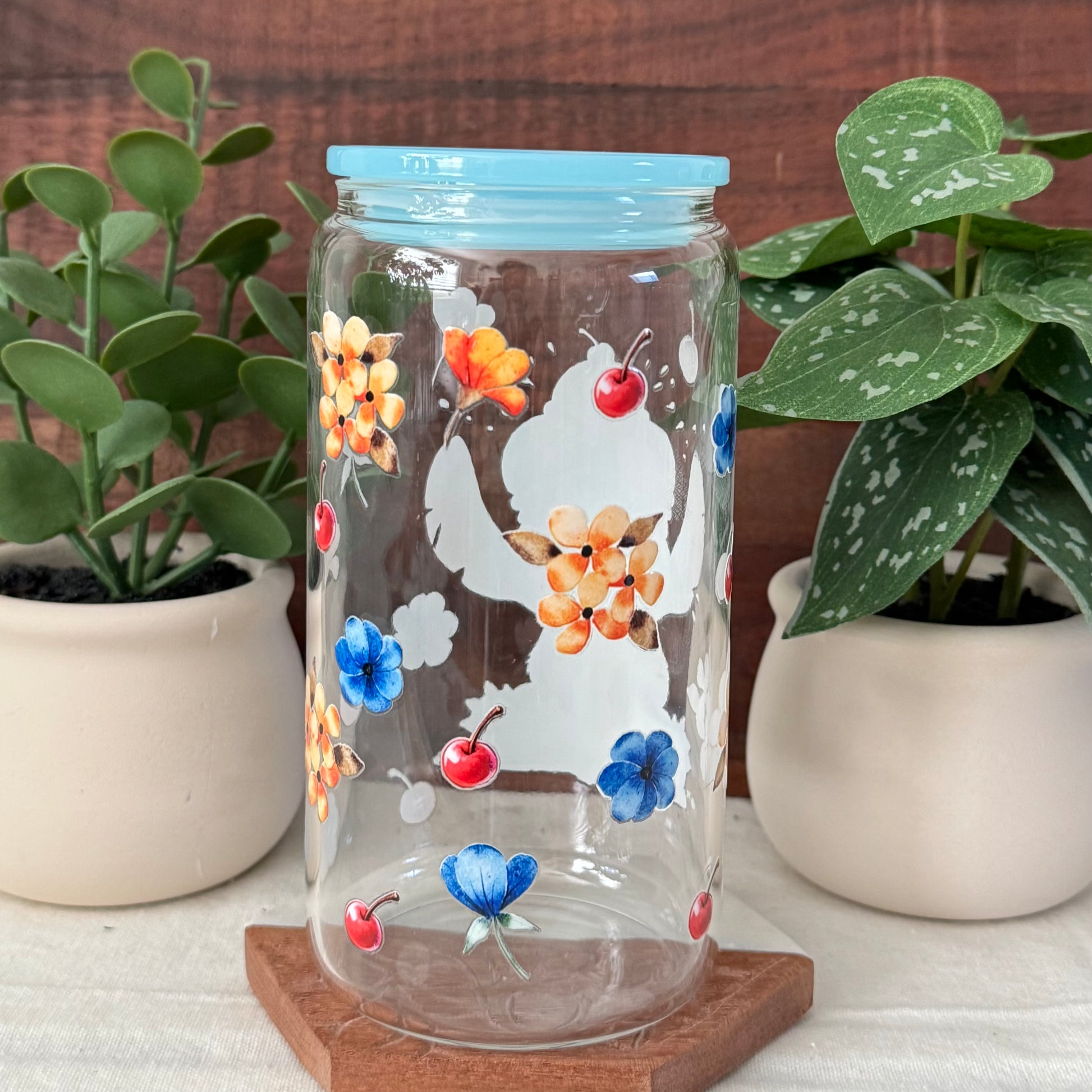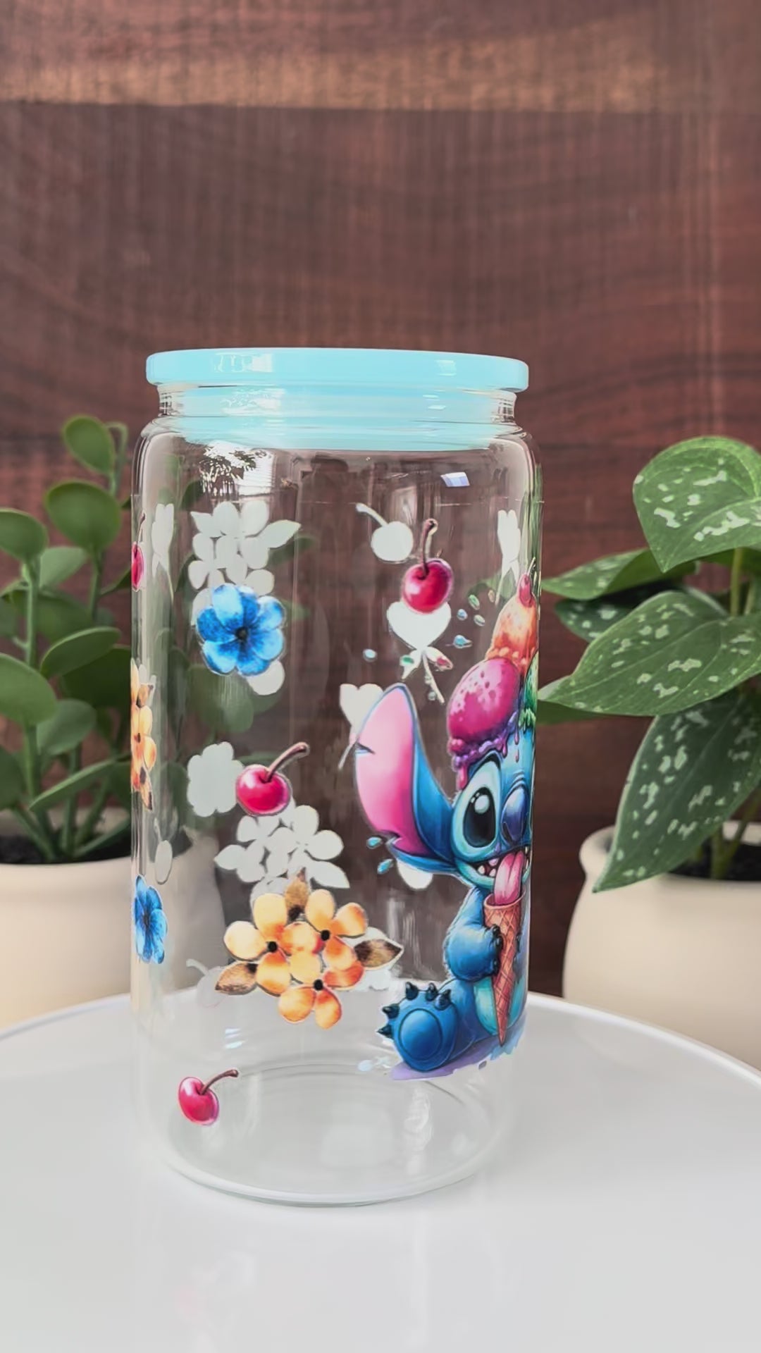 Cute glass can cup with Stitch eating ice cream. Has colorful flowers and cherries all around. Comes with a blue lid and a matching blue glass straw. Great for your favorite cold drinks!