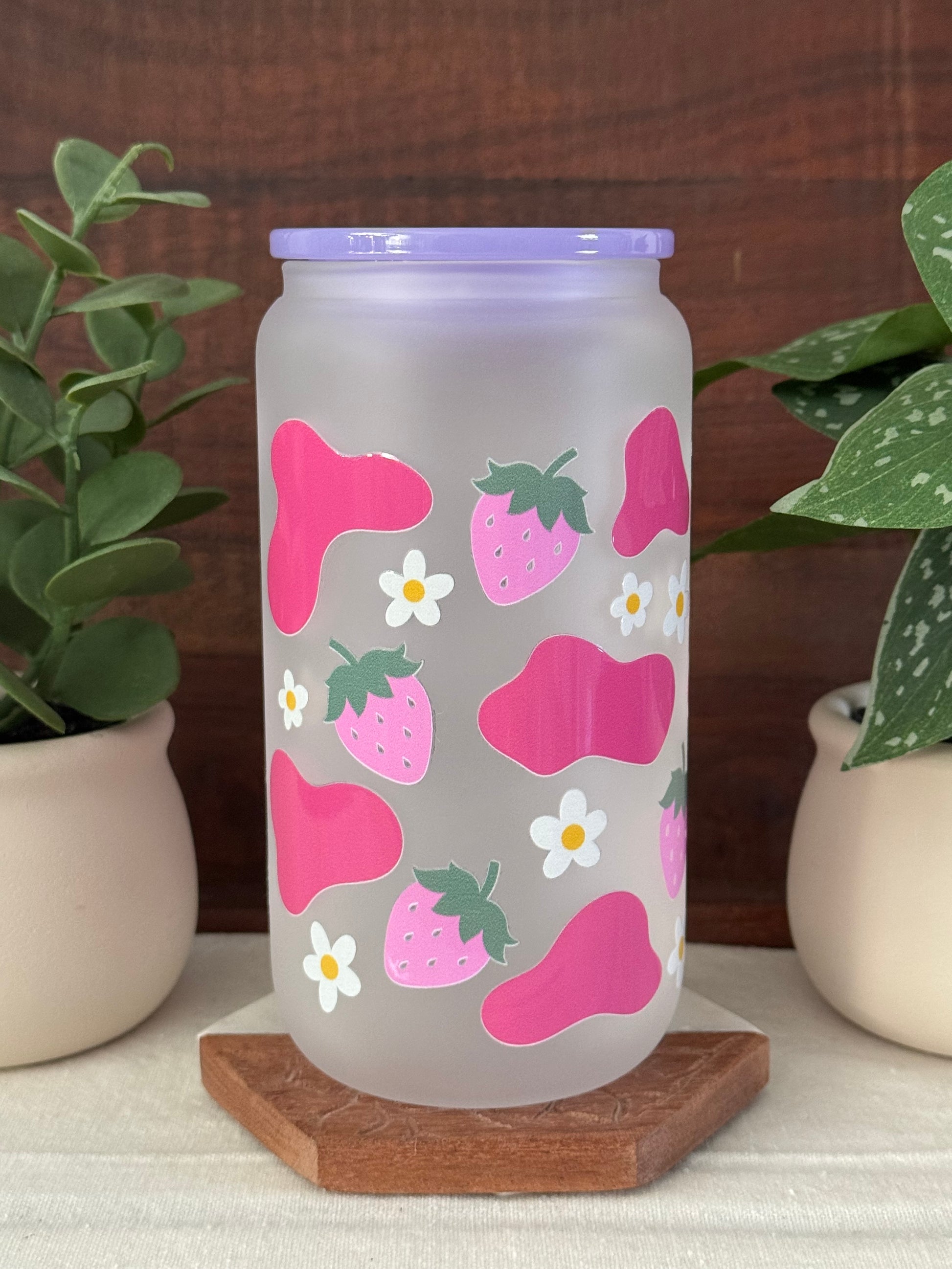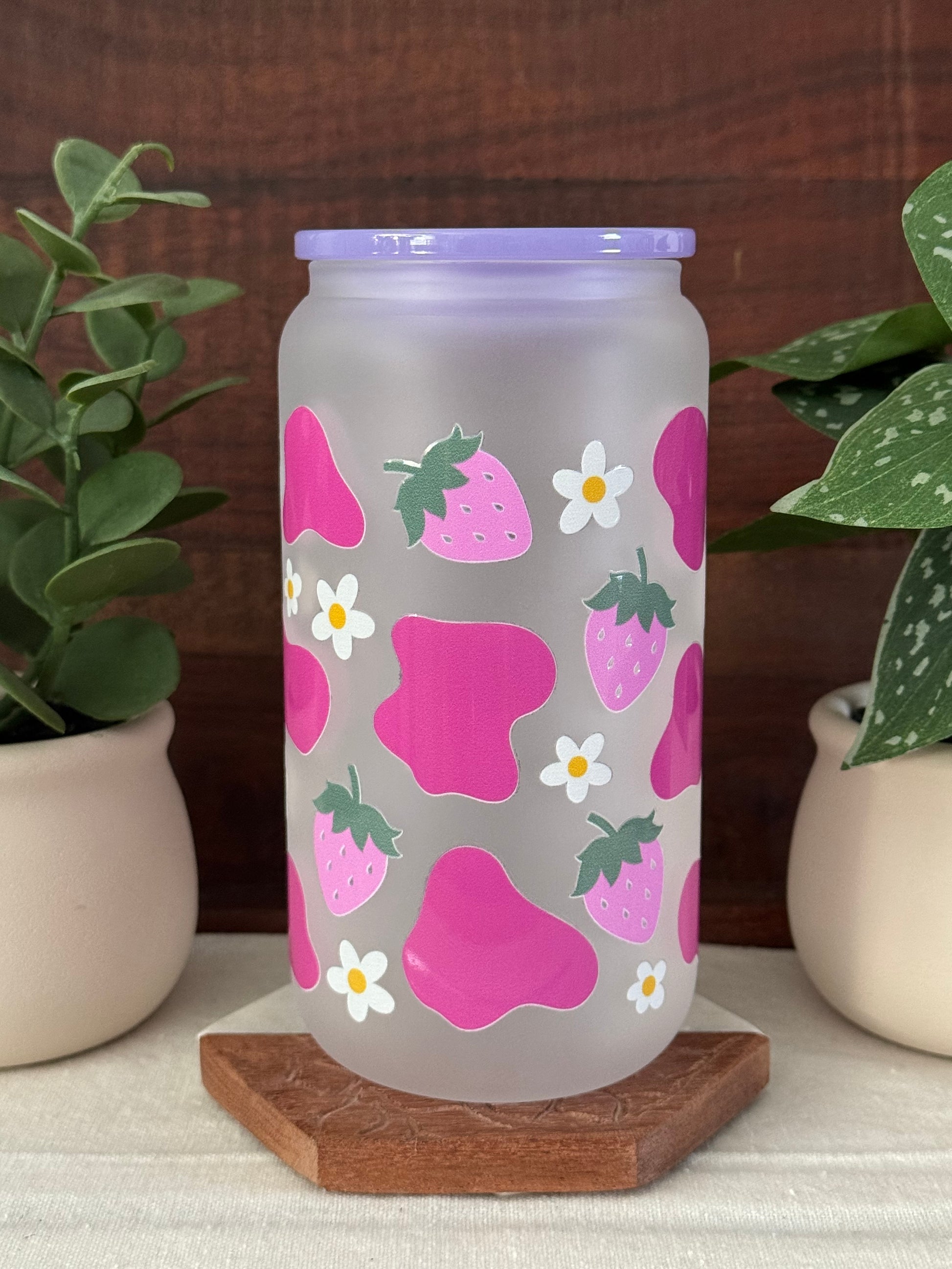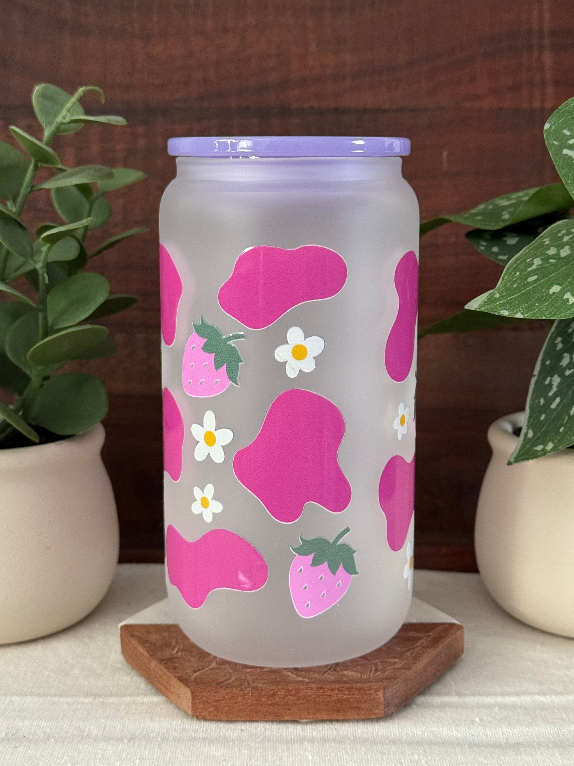 Trendy frosted glass cup. Cup has a super cute pink strawberry and cow print design with little white daisies. Comes with a light purple lid and a clear bent glass straw.