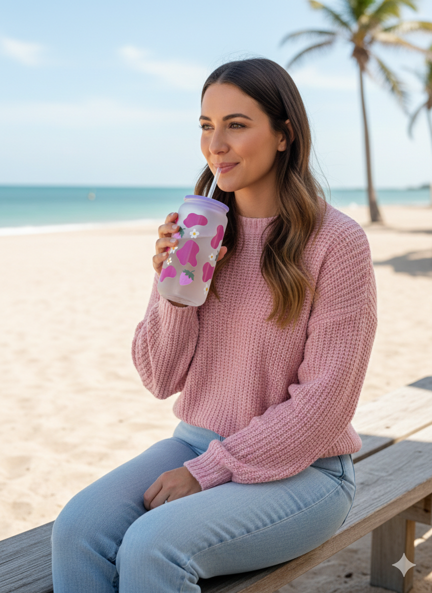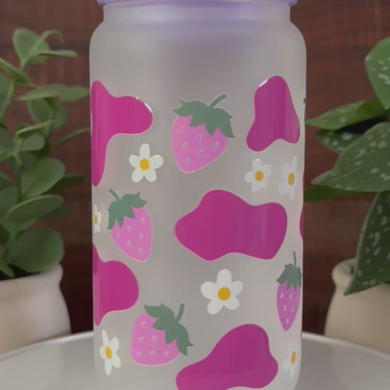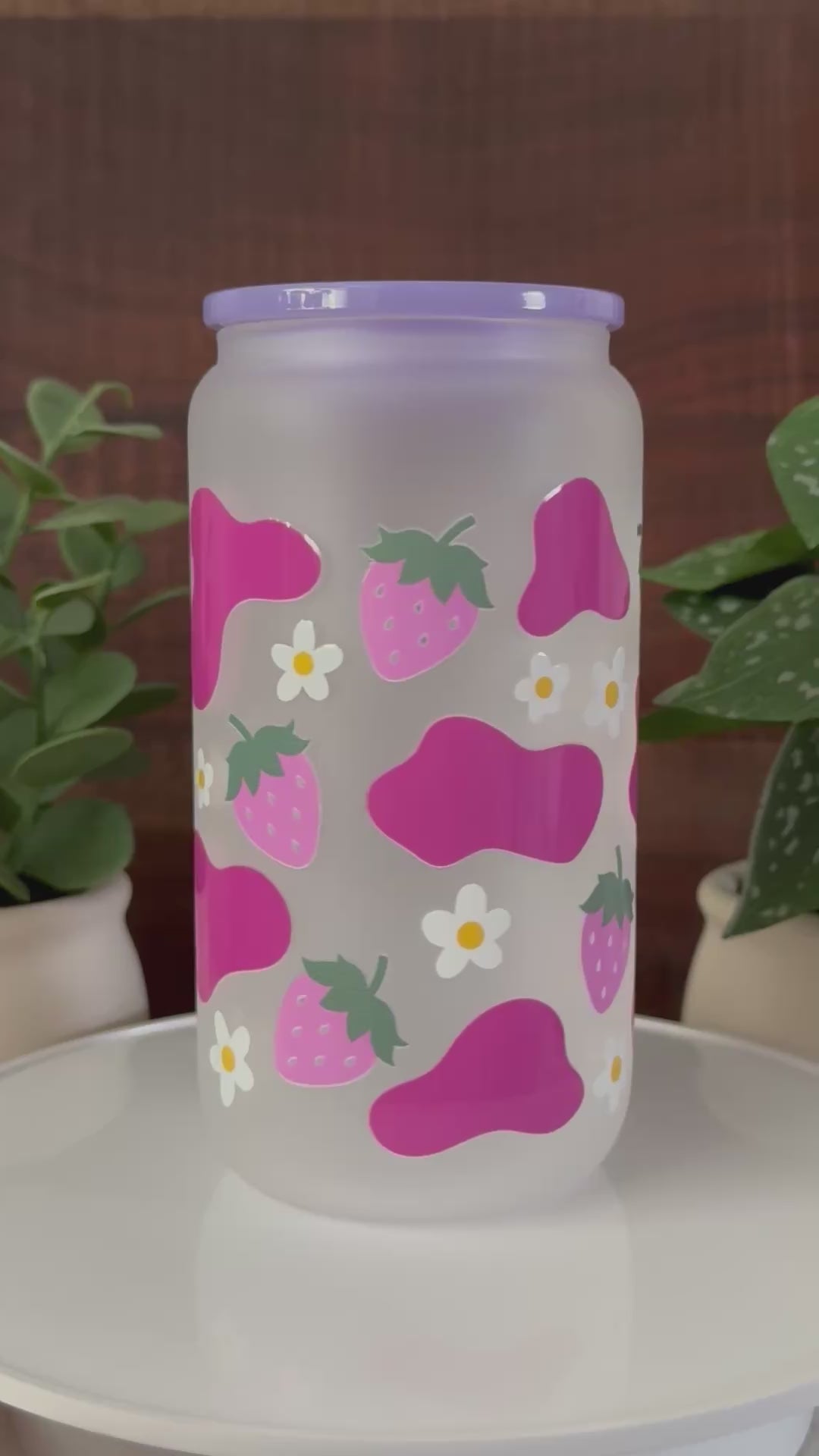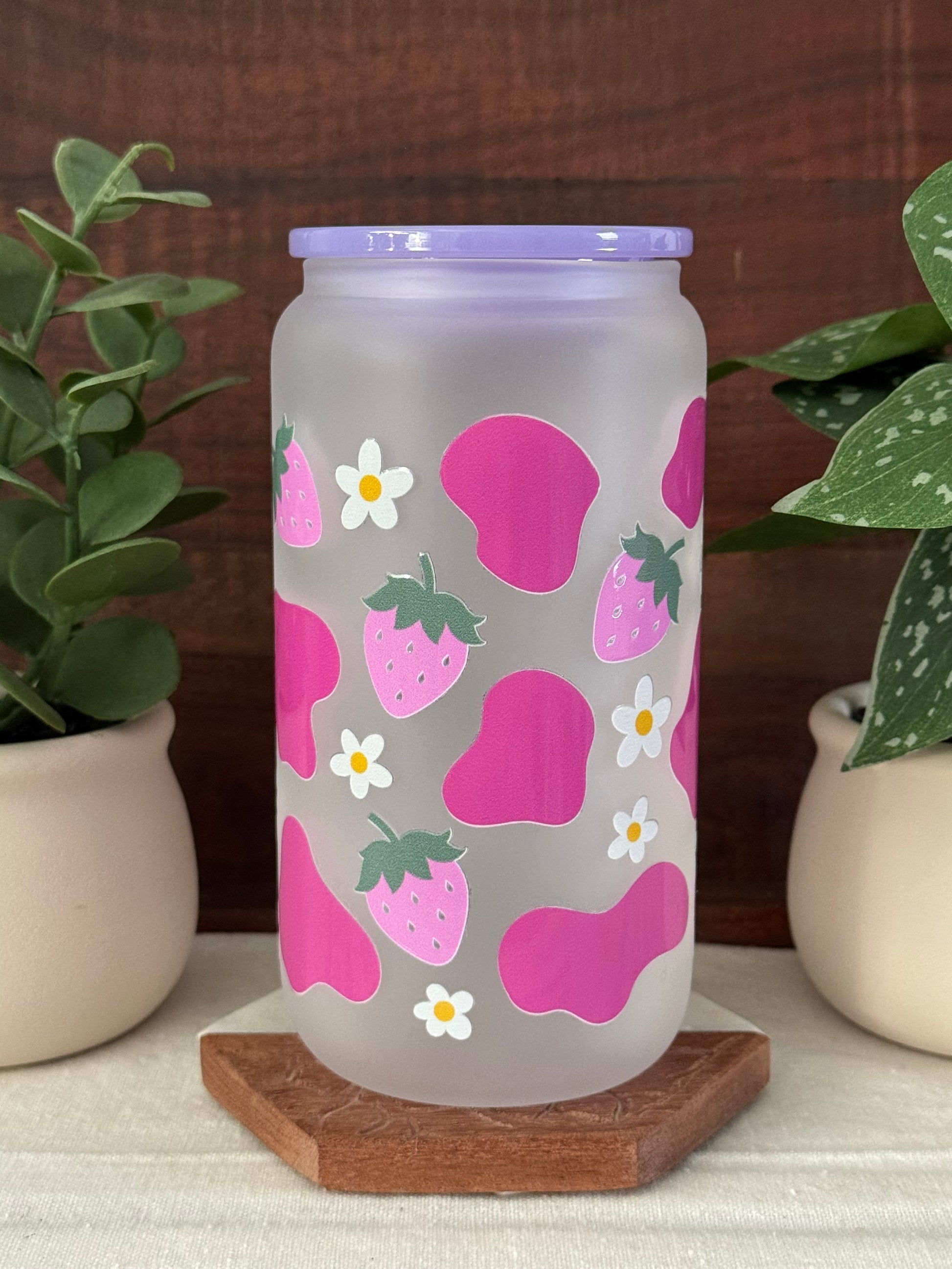 Trendy frosted glass cup. Cup has a super cute pink strawberry and cow print design with little white daisies. Comes with a light purple lid and a clear bent glass straw.