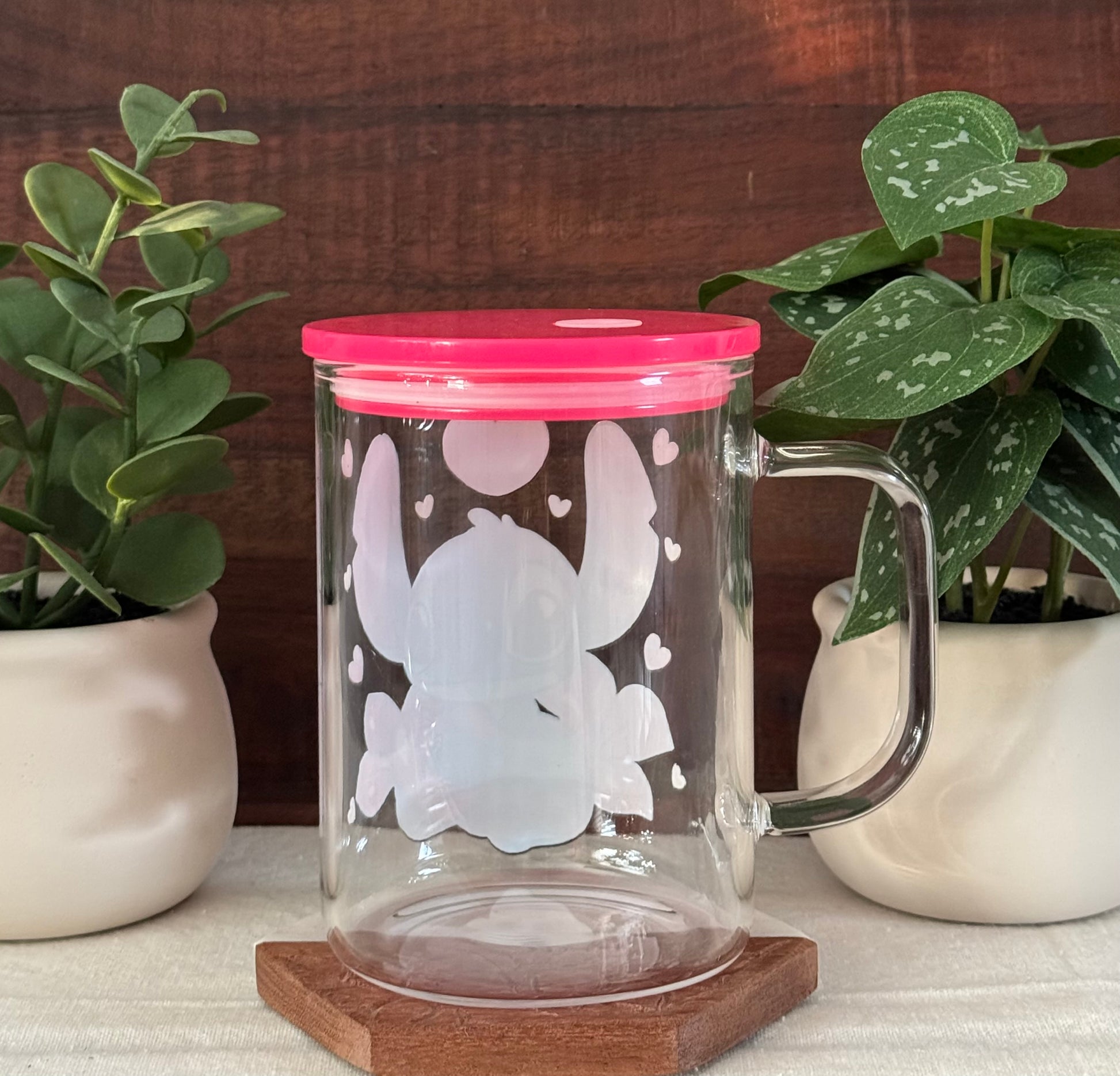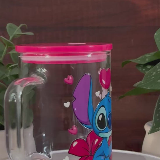 This adorable glass mug features Stitch holding a pink heart. It comes with a bright pink lid and a clear straw.